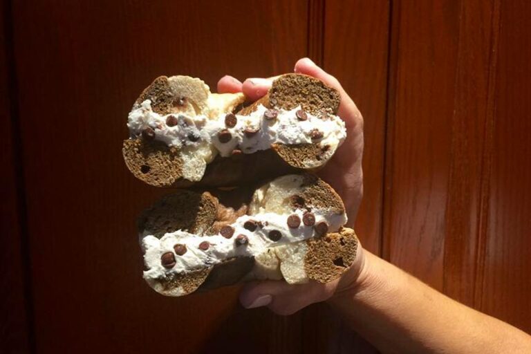 Comment est-ce possible? Eh bien, l’équipe de la boulangerie a fait un super bagel au chocolat, puis ils ont rempli la crème fraîche avec un mélange de fromage à la crème. Ajoutez quelques pépites de chocolat pour la déco et le tour est joué !