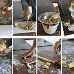 Faites cuire à l’eau salée ou à la vapeur de belles pommes de terre. Faites revenir le pain à la poêle avec de l’huile d’olive et de l’ail.