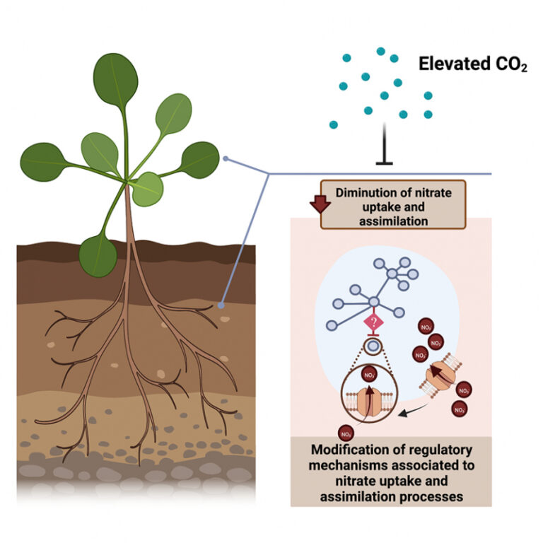 image: Dans des conditions de croissance de CO2 atmosphérique élevé, le système d’absorption et d’assimilation des nitrates dans les plantes est dérégulé, ce qui peut entraîner une réduction de la teneur en azote des plantes. Les mécanismes de signalisation et de régulation associés à cet effet négatif restent largement inconnus.