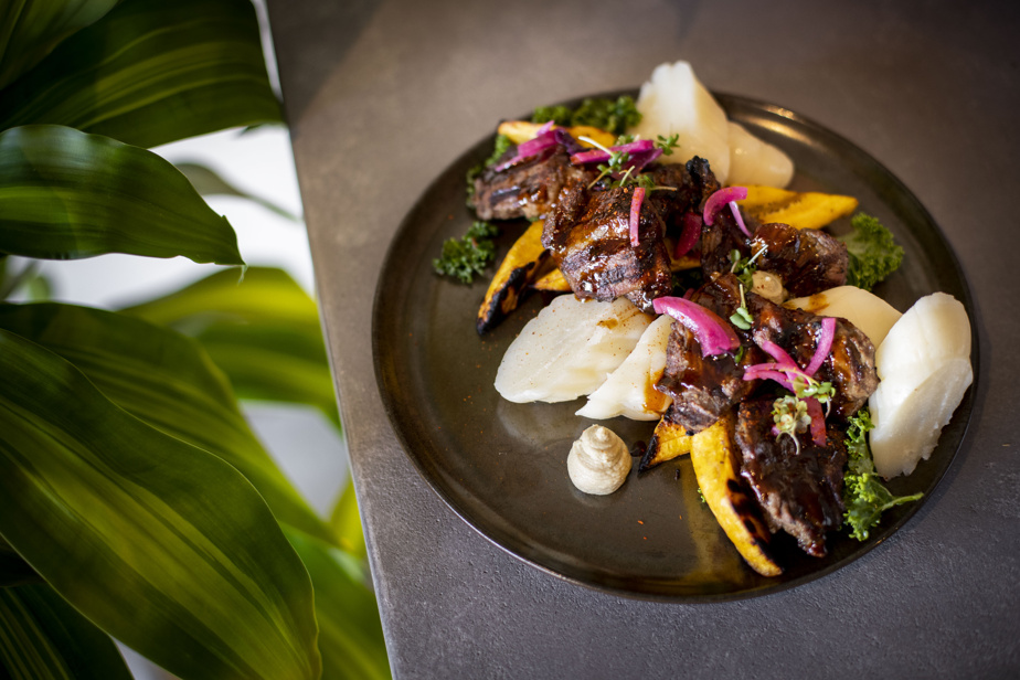 « En Afrique sub-saharienne, les cacahuètes sont partout ! dit-il avant de nous servir des brochettes de bœuf (suya), qui contiennent des épices yagi, des cacahuètes et des piments. On peut aussi trouver un délicieux ‘pinot noir’ dans sa peau. Viens garnir de kelewele , les plantains frits à la ghanéenne et bien sûr le chicken mafé sauce originaire du Sénégal.Mokili mafé est plus technique et déconstruit que le ragoût classique.Il est élégant et homogène, surmonté d’une poule convo grillée.