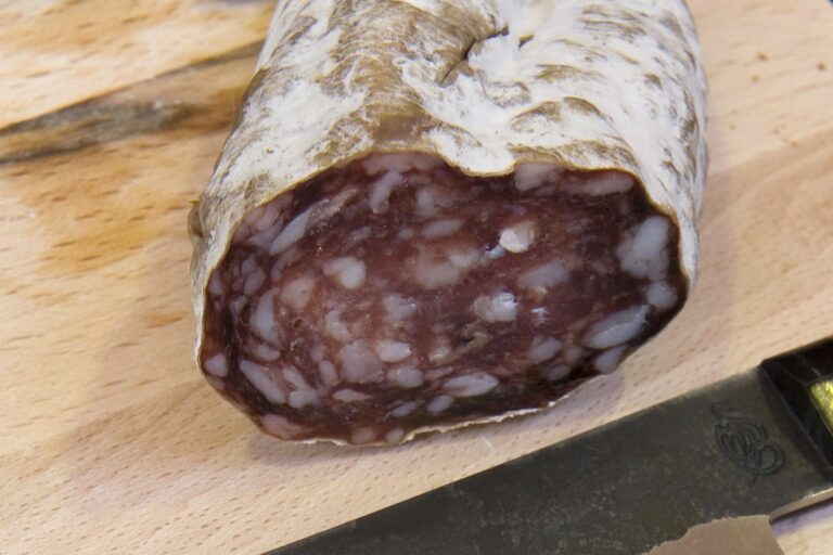 Dans le saucisson, « on hache principalement la viande de porc maigre et le gras et on mélange ensemble. On ajoute du sel, du sucre, des épices et éventuellement des herbes. On met aussi des bactéries lactiques pour bien faire fermenter. Dans la plupart des cas, on met nitrates et nitrites », Sylvie Metzelard dans Nous sommes arrivés!
