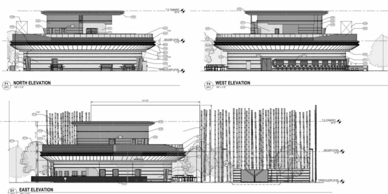 Le terrain est actuellement occupé par une pizzeria, qui sera démolie et remplacée par un bâtiment de deux étages. Le rez-de-chaussée comprendra la cuisine, un bar avec tabourets, des alcôves et un second bar extérieur dans l’angle du bâtiment. Au deuxième étage se trouvent un patio, un autre bar, quelques tables et deux rangées de sièges, disposés comme un théâtre, à l’opposé du comptoir et face au parking, qui accueillera 29 superchargeurs et cinq bornes de type 2. Les employés des restaurants seront également autorisés à apporter les commandes directement aux wagons en cours de chargement.